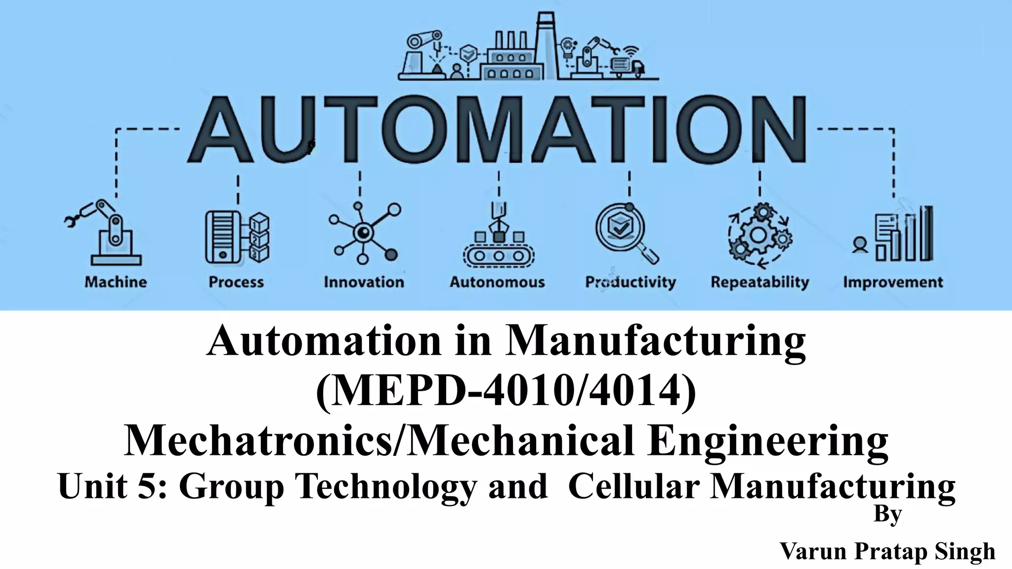 Group technology (GT) and cellular manufacturing involve grouping similar parts into families and arranging production machines into cells dedicated to each family. This improves production efficiency by reducing material handling needs and setup times. Key tasks for implementing GT include identifying part families and rearranging machines into cells. Common methods for identifying families are visual inspection, parts classification/coding systems, and production flow analysis. Parts classification systems involve assigning codes to parts based on design and manufacturing attributes to facilitate grouping. A well-known example is the Opitz coding system, which uses a nine-digit code describing attributes like shape, features, dimensions and processes. Production flow analysis examines the production steps for each part to group parts with similar flows.