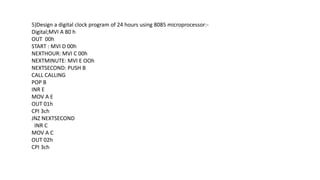 2. It includes programs to design a digital clock displaying hours, minutes and seconds, as well as code to operate a relay to turn street lights on from 8:00am to 5:00pm.