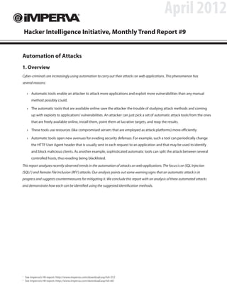 The April 2012 Hacker Intelligence Initiative report discusses the increasing automation of cyber-attacks on web applications, particularly focusing on SQL injection and remote file inclusion attacks. Automation tools allow attackers—regardless of skill— to efficiently exploit multiple vulnerabilities while evading detection through techniques such as manipulating HTTP headers and distributing requests across multiple hosts. The report also suggests identification methods and countermeasures to mitigate the impact of automated attacks, emphasizing the importance of traffic analysis and tool fingerprinting.