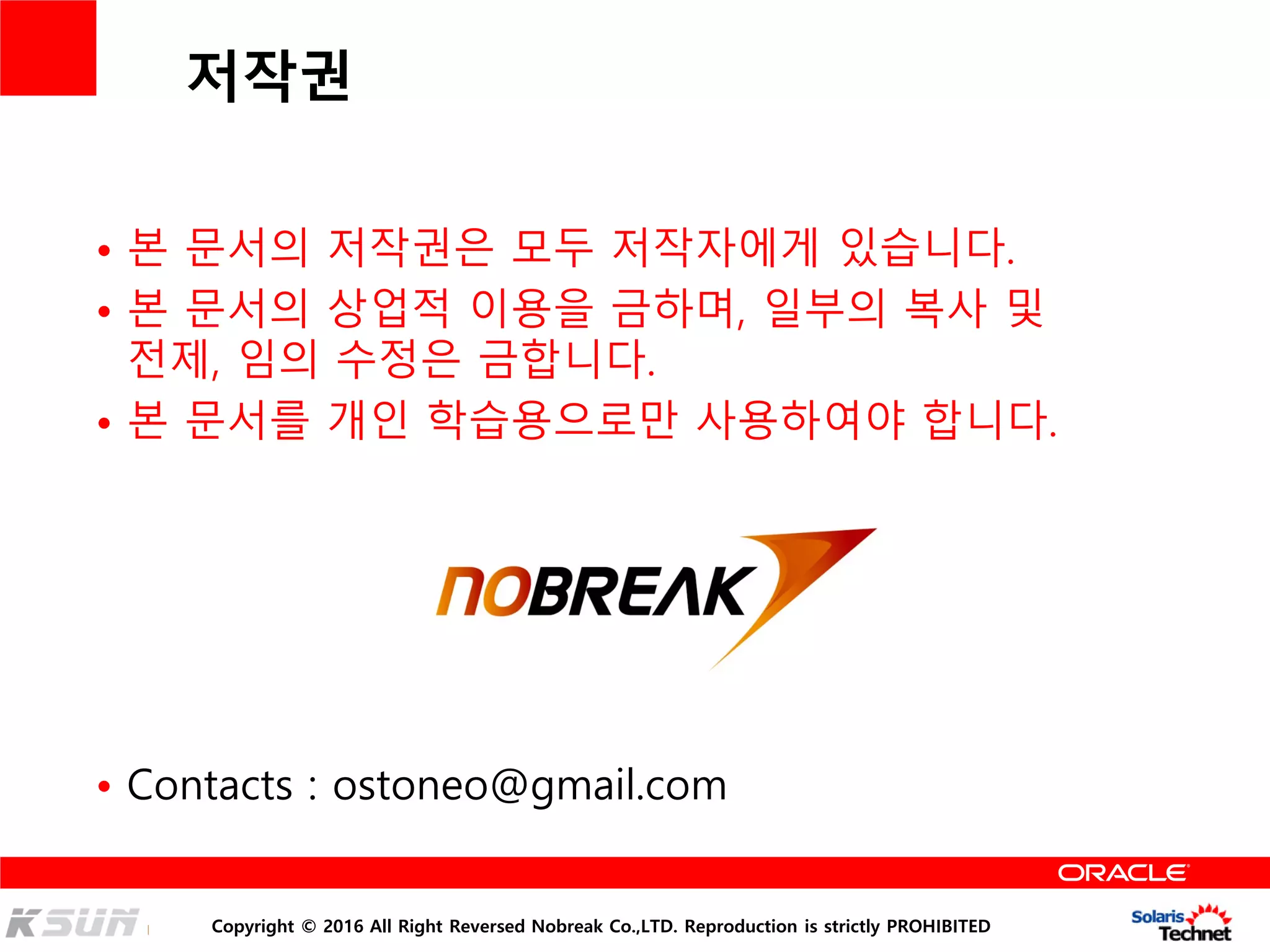 All Right Reversed Nobreak Co.,LTD. Reproduction is strictly PROHIBITED 발표자 소개 • 김석 ( nick : 김재벌 ) • 현) 오라클 에이스 디렉터 ( Oracle ACE Director ) • 현) 주식회사 노브레이크 수석컨설던트 / 대표이사 • 현) 안산대학교 IT응용보안과 겸임교수 • 현) 한양사이버대학교 해킹보안과 강사 • 현) 솔라리스 테크넷 운영자 • 현) 솔라리스 스쿨 운영자 • 현) 블로그 “김재벌의 IT 이야기”