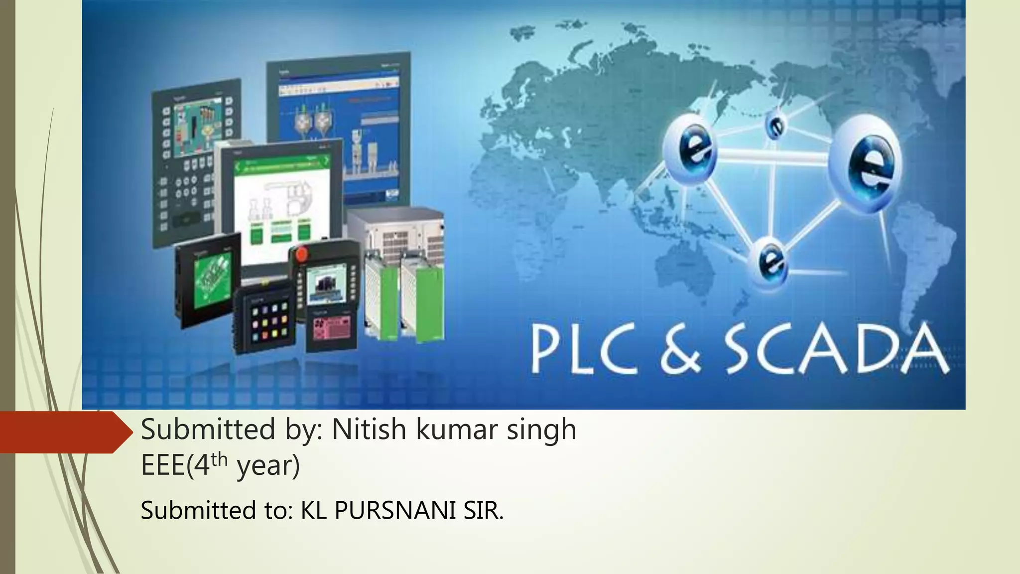 This document provides an overview of programmable logic controllers (PLCs) and supervisory control and data acquisition (SCADA) systems. It discusses the history and evolution of automation and PLCs, describes common PLC components and programming, and reviews the MicroLogix 1000 PLC and RSLogix5000 programming software. Key features of SCADA systems are also summarized, including dynamic graphics, alarms, recipe management, security, connectivity, databases, and scripting. The document is submitted by Nitish Kumar Singh for review by KL Pursnani and covers automation, PLCs, ladder logic, MicroLogix1000, and SCADA systems at a high level.