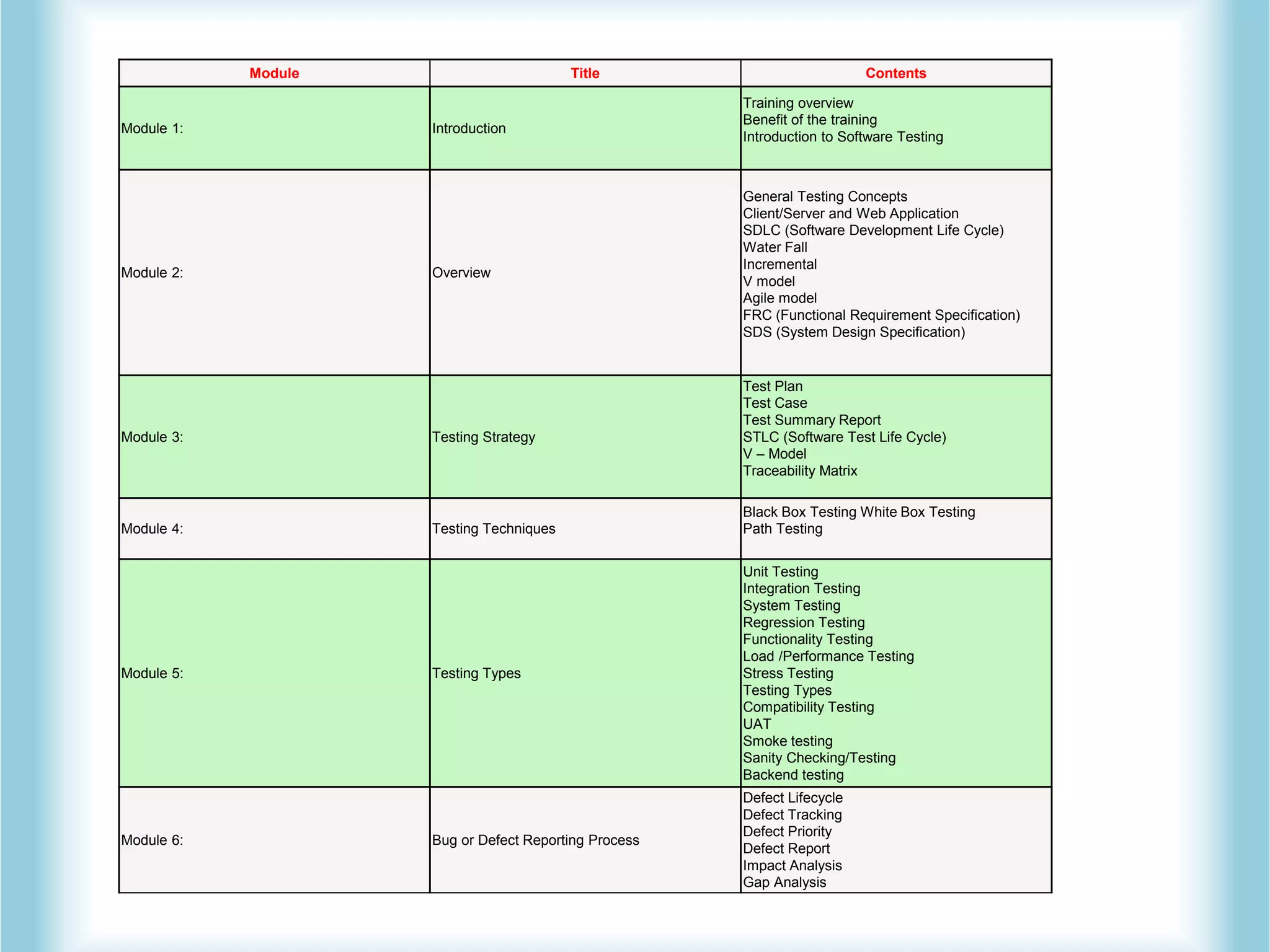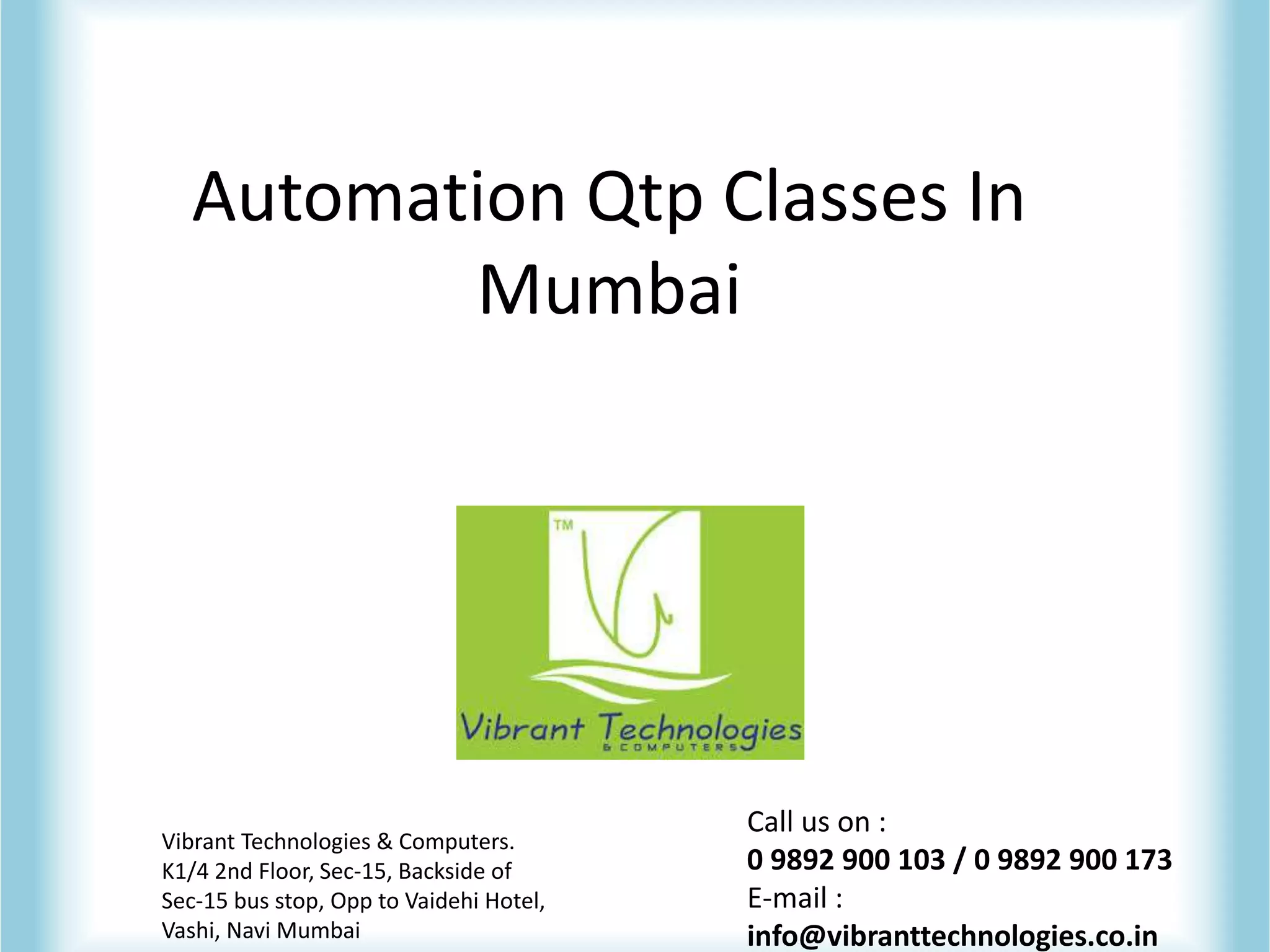 This document outlines the modules and contents of an Automation Qtp Classes training program. The 13 modules cover topics like introduction to software testing, testing concepts, strategies and techniques, defect reporting, benefits of automation testing with Qtp, and integration of Qtp with Quality Center. Module contents include testing methodologies, test planning, execution, parameterization, object repositories, checkpoints, actions, descriptive programming, and reporting in Qtp. The final modules discuss the Requirements, Test Plan, Test Lab, and Defect modules in Quality Center and how to create reports and graphs for analysis.