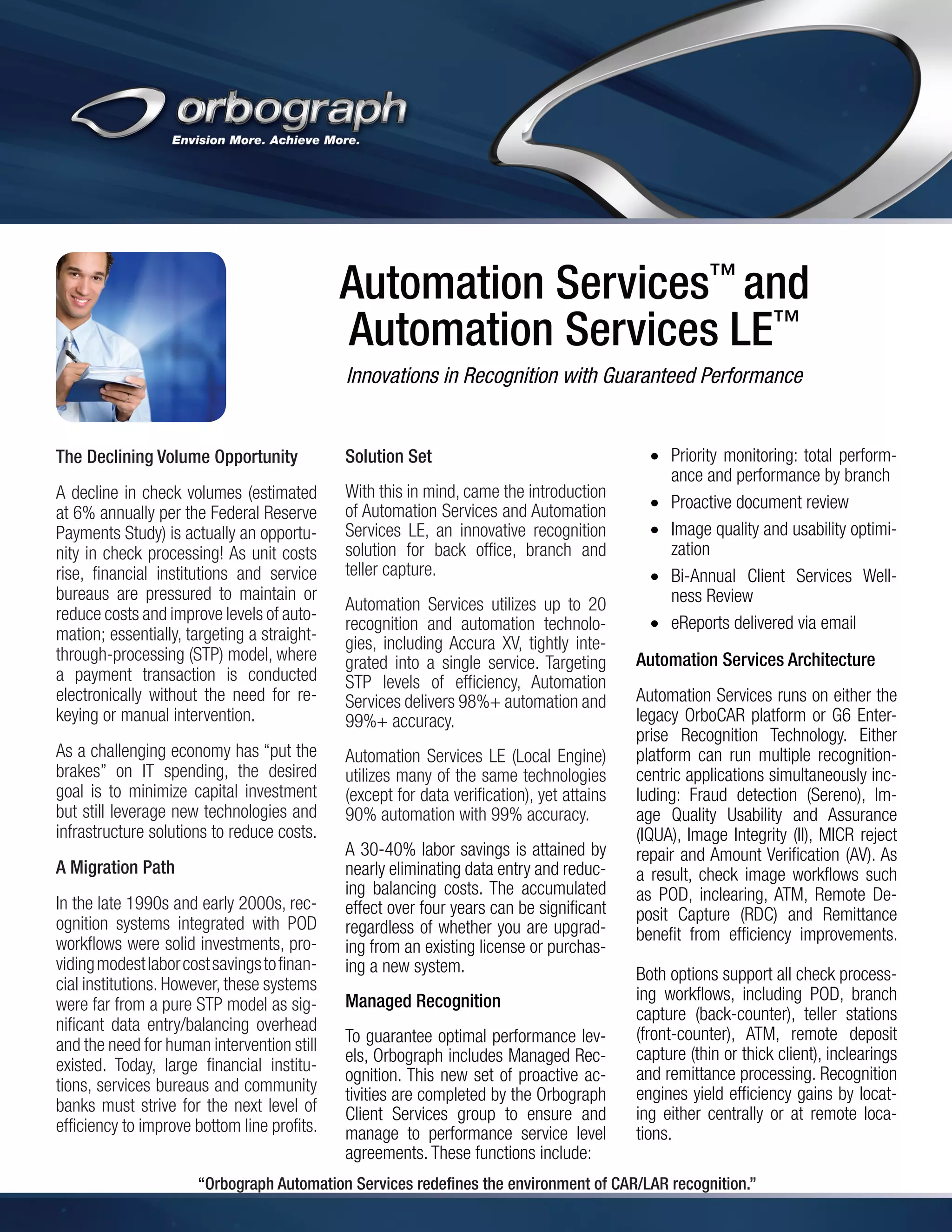 Orbograph introduces Automation Services and Automation Services LE, innovative recognition solutions that provide up to 40% labor cost savings through high levels of automation and accuracy. Automation Services achieves 98% automation and 99%+ accuracy, while Automation Services LE attains 90% automation with 99% accuracy. Both solutions support various check processing workflows and can be implemented on Orbograph's legacy OrboCAR platform or new G6 Enterprise Recognition Technology platform. Orbograph also offers managed recognition services to continuously monitor performance and ensure solutions meet guaranteed service levels.