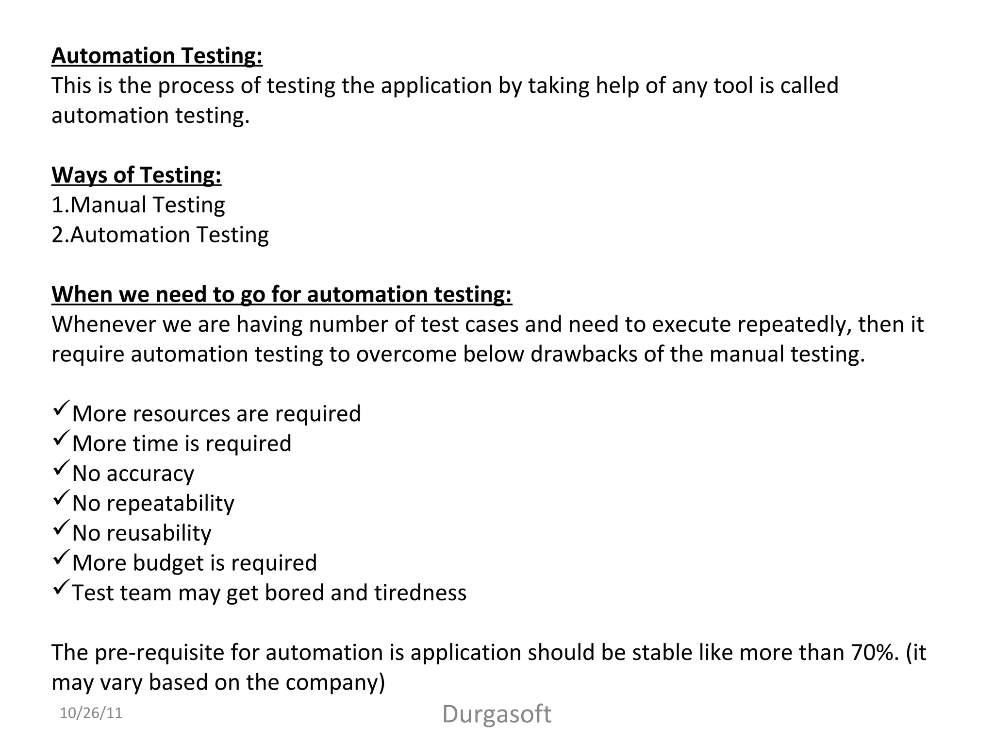 The document discusses automation testing tools QuickTest Professional (QTP) and Unified Functional Testing (UFT). It provides an overview of QTP, describing its features such as scripting language, supported applications and browsers. The document also covers QTP concepts like object repository, object spy, standard classes and object methods.