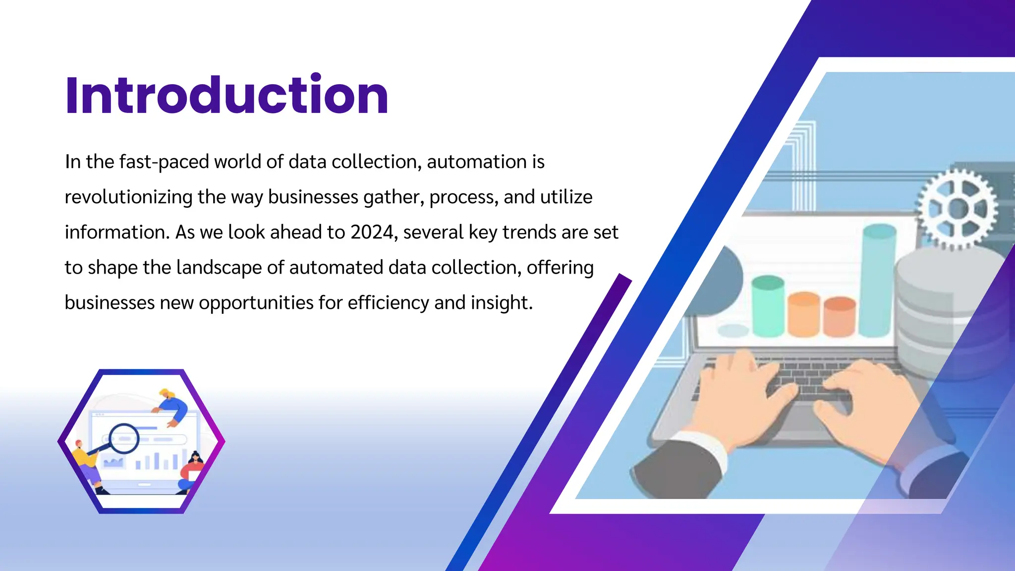 The document outlines key trends in automated data collection for 2024, emphasizing the democratization of technology, the rise of web-based platforms, and the integration of AI to enhance efficiency and accuracy. It discusses various innovations such as automated data capture solutions, IoT integration, and robust security measures that businesses must adopt to remain competitive. Additionally, the importance of human-AI collaboration and predictive analytics in shaping strategic decision-making is highlighted.