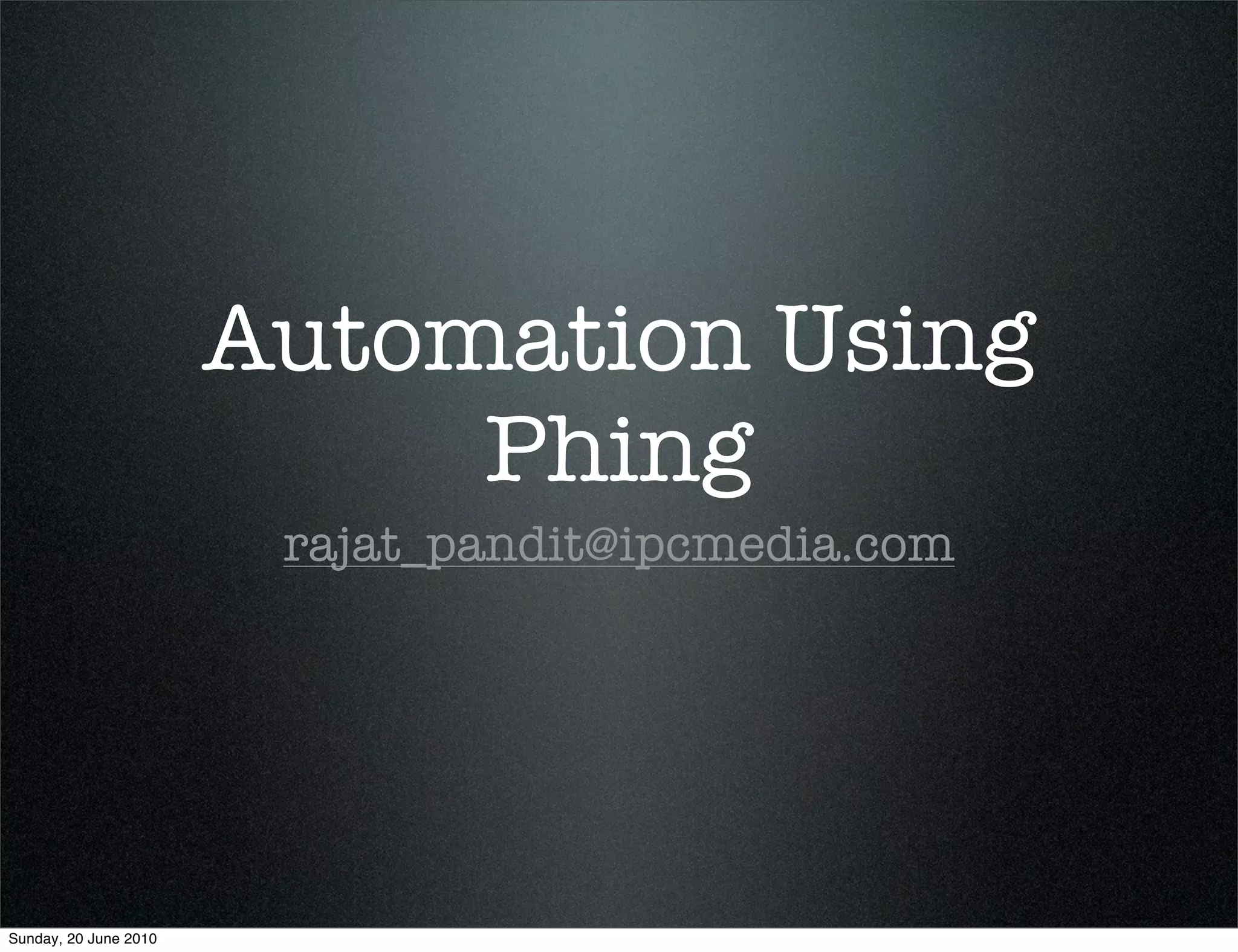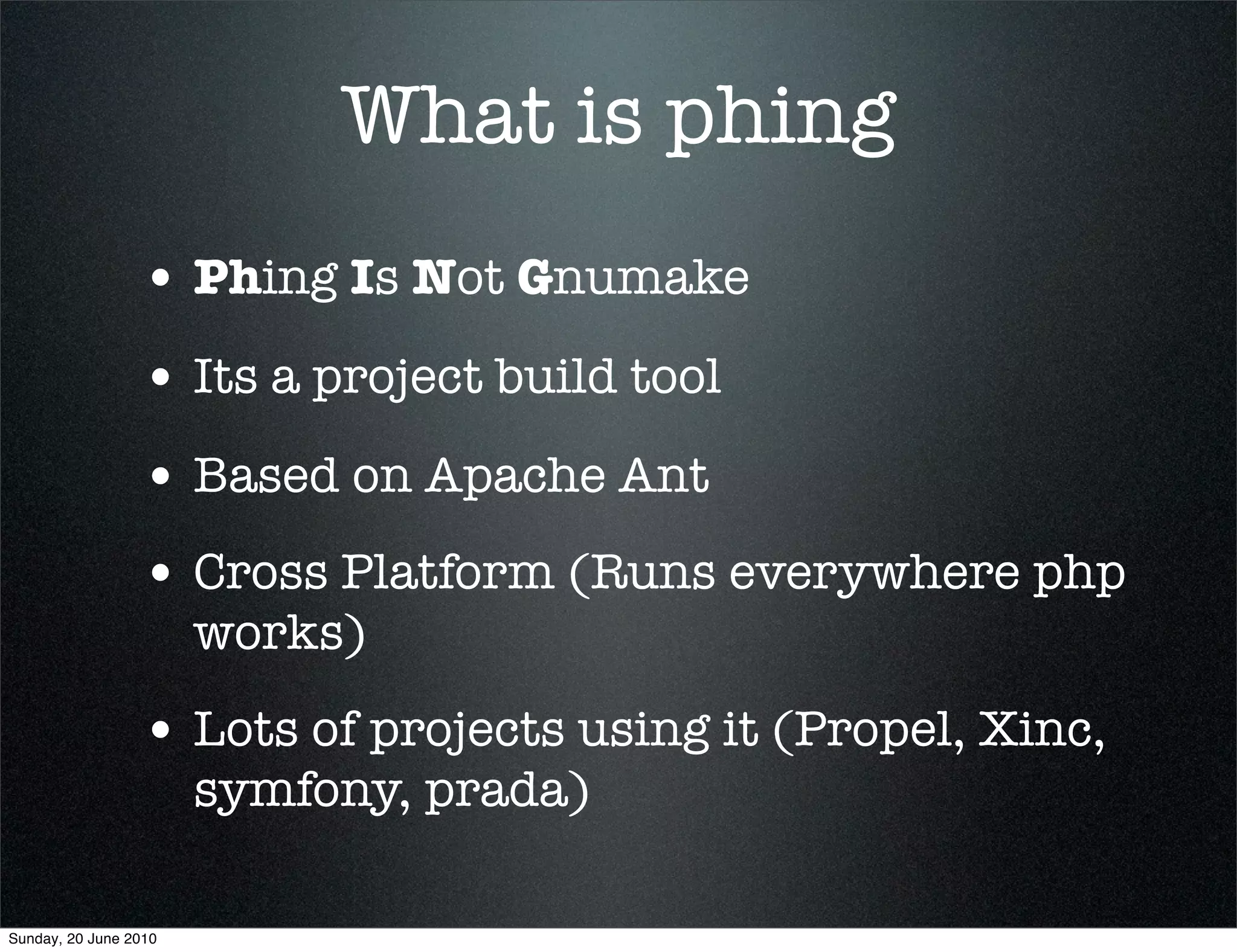 This document provides an overview of Phing, an open source build tool based on Apache Ant. Phing allows users to automate tasks like configuration, packaging, deployment, testing and more through PHP scripts. It is cross-platform and supports features like running tasks in parallel, filtering files, transforming data and extending functionality through custom tasks and extensions. The document demonstrates how to write Phing build scripts and utilize core tasks and functionality like file selection, property handling, conditionals and more.