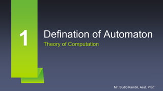 The document provides an overview of automata theory, detailing the definition, characteristics, and various types of automata, including finite automata, deterministic finite automata (DFA), and non-deterministic finite automata (NDFA). It explains the basic components of automata such as states, transition functions, input, and output relations, as well as examples like vending machines and traffic lights. The document also covers related terminologies, including alphabet, strings, Kleene star, and language sets.