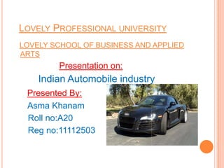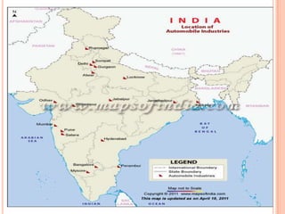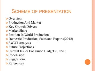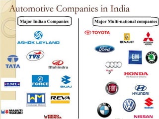 The document provides an overview of the Indian automobile industry. It discusses key topics such as production and market share, growth drivers, domestic production and exports in 2012, SWOT analysis, and future projections. The automobile industry is an important sector in India, manufacturing over 11 million vehicles annually. Major players like Maruti Suzuki and Tata Motors dominate different vehicle segments. Factors like rising incomes, financing availability, and government policies are driving growth in the industry.