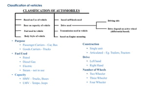 An automobile is a self-propelled vehicle used for transporting goods and passengers on the ground. Examples include mopeds, scooters, motorcycles, cars, jeeps, trucks, tractors, ships, aircrafts, and rockets. The history of automobiles began in 1801 with the steam carriage and progressed through important milestones like the first gas-powered automobile in 1885. Automobiles are classified based on their purpose, fuel used, and capacity. The main components of an automobile include the chassis, engine, brakes, steering system, and wheels. The chassis provides the main supporting structure and consists of the engine, brakes, steering, and wheels mounted on a frame.