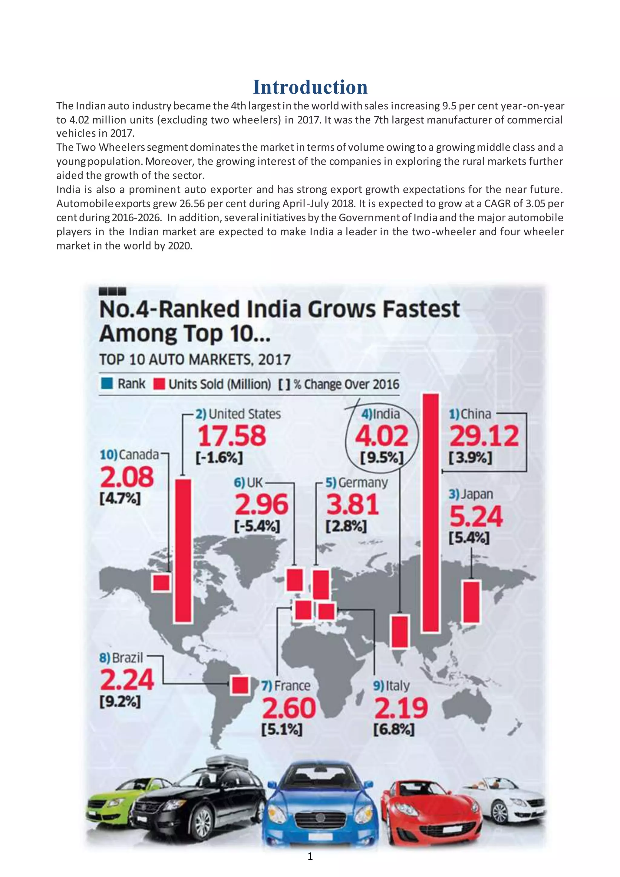 The Indian auto industry became the 4th largest in the world in 2017 with sales increasing 9.5% to 4.02 million units. Two-wheelers dominate the market due to India's growing middle class and young population. The government has implemented several initiatives to make India a global leader in the two-wheeler and four-wheeler markets by 2020. Marketing involves creating, communicating, delivering and exchanging offerings of value to customers. Tata Motors is India's largest automobile manufacturer, producing commercial vehicles, trucks, buses and passenger cars. It has established brand recognition and focuses on innovation, quality control, competitive pricing and dealership-based distribution.