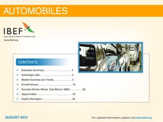 The automotive industry in India has grown significantly over the past decade and is projected to continue strong growth. Two-wheeler sales are expected to rise from 15.9 million units in 2013 to 29.1 million by 2020 with an overall CAGR of 9%. Passenger vehicle sales are projected to increase from 3.2 million units in 2013 to 9 million by 2020, a CAGR of 16%. The industry is supported by strong domestic demand, rising incomes, favorable policies, and investment. India has the potential to become a global automotive manufacturing hub.