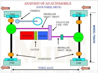 This document provides an introduction to automobile engineering. It discusses the history of automobiles from early steam-powered vehicles to modern internal combustion engines. It then summarizes key automobile systems and components, including the engine, power train, suspension, steering, braking, and electrical systems. The engine is described as the power plant, with subsystems like fuel injection, ignition, lubrication, cooling, and exhaust. The document outlines the major developments in automotive technology and concludes with a brief overview of vehicle design and manufacturing innovations.