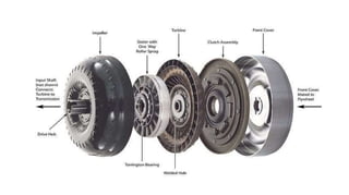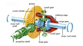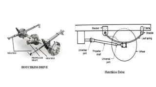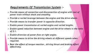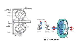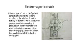 The document describes various types of clutches used in mechanical power transmission, outlining their structures, operations, and advantages/disadvantages. It discusses single plate clutches, multi-plate clutches, cone clutches, centrifugal clutches, diaphragm clutches, and other systems like hydraulic, vacuum, and fluid coupling clutch mechanisms. Additionally, it covers propeller shafts and universal joints, explaining their functions and importance in vehicle drivetrains, particularly in enabling different wheel speeds during turns.