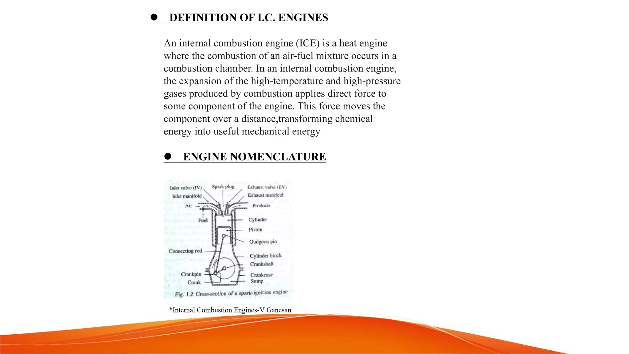 The document discusses internal combustion engines. It defines an ICE as an engine where combustion of an air-fuel mixture occurs within a combustion chamber, applying force to move components. ICEs are classified based on their cycle of operation (Otto or diesel), fuel used (gasoline, diesel, gas), charging/cooling methods, cylinder arrangement, camshaft layout, and more. ICEs are used in various applications like road vehicles, aircraft, marine vehicles, and power generation.