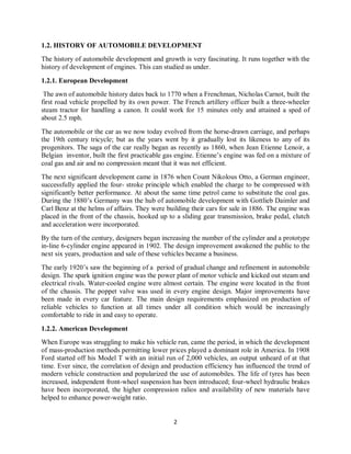 The document provides an overview of automobile engineering and the history of automobile development. It discusses: