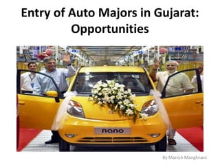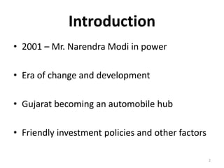 Gujarat has emerged as a major automobile hub in India since the early 2000s. Several major automakers like Tata Motors, Ford, Maruti Suzuki, and Peugeot have established manufacturing plants in Gujarat, attracted by the state's pro-business environment, excellent infrastructure like ports and roads, availability of land and power, and supportive government policies. The city of Sanand in particular has become a major automobile manufacturing cluster, with plants by Tata Motors, Ford, and Peugeot bringing new jobs and economic opportunities to the region. The growth of the automobile industry in Gujarat has large benefits for the Indian economy through job creation and potential to increase exports.