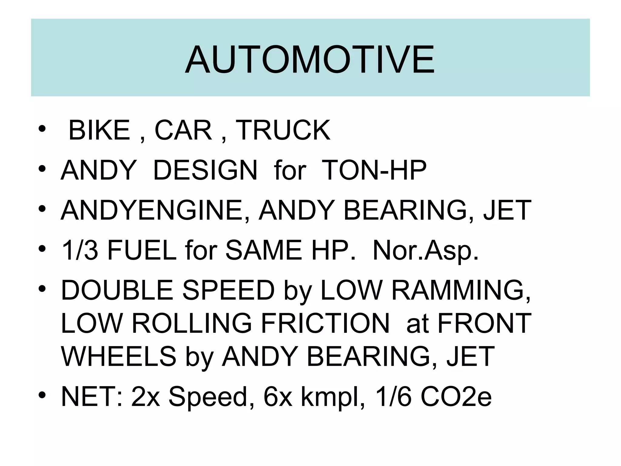 The document describes Andy's new designs for vehicles that significantly improve fuel efficiency and reduce emissions compared to current designs. Andy's bike design uses 1/3 the fuel and emits 1/6 the CO2 while achieving double the speed. His car and truck designs also use less fuel, produce fewer emissions, and have higher fuel efficiency and speeds than current designs. The document also briefly outlines Andy's new sea vehicle design with a single axle and front steering and rear propulsion without rear wheels. Andy's engine can use all fuels and is smaller than current engines but provides comparable power output. Production of Andy's vehicles is estimated to require investments of $30-100 million but yield profits of $150-200 million.