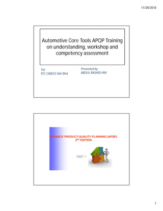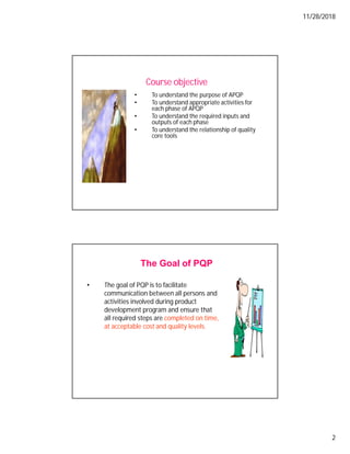The document discusses an APQP training on understanding the phases and activities of Advanced Product Quality Planning, which is a structured method for product development that aims to facilitate communication and ensure all required steps are completed on time, at acceptable cost and quality levels. It provides an overview of the 5 phases of APQP - plan and define program, product design and development, process design and development, product and process validation, and feedback, assessment and corrective action. The training covers topics such as voice of the customer, design for quality, concurrent engineering, product costing, and risk analysis.