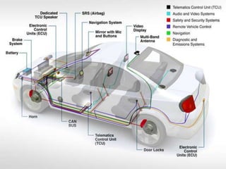Body electronics allow for remote access and control of vehicle doors and windows. In-vehicle infotainment provides navigation, audio, and video entertainment through devices connected to surround sound systems. Carputers integrate smartphones, tablets, and other mobile devices into vehicle dashboards through touch screens and software. Chassis electronics and telematics monitor and manage vehicle operations, location, and communications through technologies like GPS and RFID.