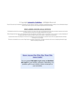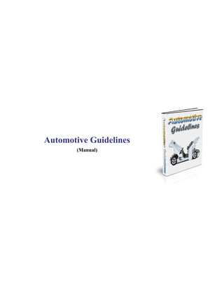 The document provides comprehensive automotive guidelines covering various aspects of buying new and used cars, obtaining car loans, leasing, and vehicle maintenance. It emphasizes the importance of thorough research, budgeting, and understanding vehicle features to make informed decisions, while also highlighting legal disclaimers regarding the accuracy of the information presented. Additionally, the document includes practical tips for both buyers and vehicle owners to help save money and enhance their automotive experience.