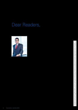 The document discusses trends in the global automotive industry. It highlights how the industry is undergoing changes in business models and value chains due to pressures to be more flexible, mobile, and environmentally friendly. It explores topics like alternative fleet management strategies, the recovery of the US automotive industry, the role of branding through Formula 1, and the future of China's auto market. The magazine aims to transparently inform readers about current trends in the automotive sector through these articles analyzing various aspects of the industry.