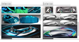 The document describes a design project to create a single-seat transport vehicle that can merge with other vehicles to expand into a four-seater. The vehicle would use advanced polymers and technology to allow an open space between users when merged. Concept sketches show the exterior and interior forms as well as inspiration from Mexican eagle feathers, the city of Mexico City, and surface treatments based on Kodo design language.