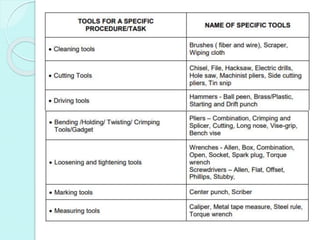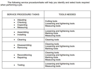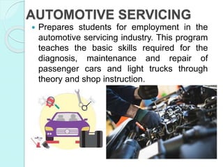 The document provides information about an automotive servicing training program. It teaches the basic skills required for diagnosis, maintenance, and repair of passenger cars and light trucks. It identifies exterior parts of a vehicle's body from a picture and discusses factors to consider when planning and preparing for automotive repair tasks, such as having the proper workplace, materials, tools, safety procedures, and waste disposal. It stresses the importance of using tools that are in good condition and suitable for the job.