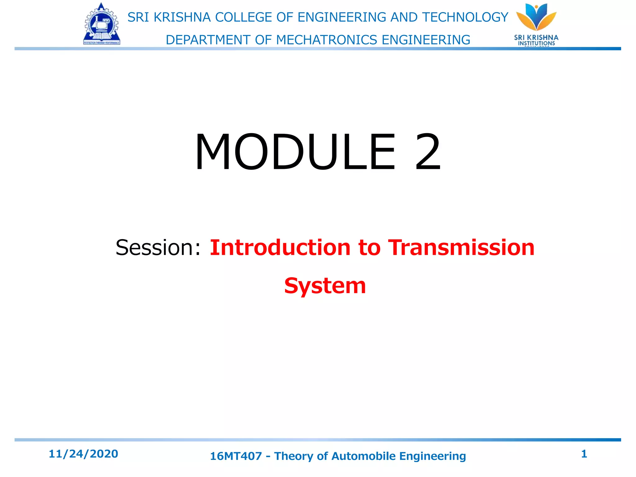 This document is an educational material from Sri Krishna College of Engineering and Technology focused on transmission systems in automobiles, detailing the importance, functions, and types of transmission systems and gears. It covers concepts such as gear ratios, gear trains, different types of gears, and specific transmission types like sliding mesh and synchromesh. Additionally, it explains the principles and mechanics involved in each transmission type, emphasizing their advantages and disadvantages.