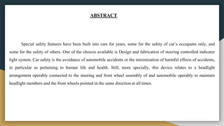 This document summarizes a student project to design and fabricate an automatic indicator system for vehicles. The system links the vehicle's steering mechanism to the headlights so that the headlights always illuminate in the direction the front wheels are turning. It aims to improve safety during night driving, especially on winding mountain roads. The design uses rack and pinion steering gear to convert rotational steering wheel motion to linear front wheel motion. Cables then connect the steering to the headlights so they move in tandem with the wheels. The system was built and tested as part of an engineering student project.
