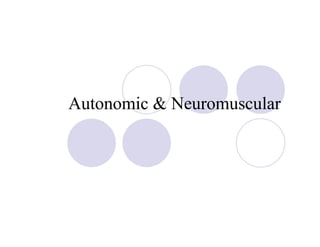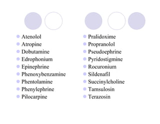 This document summarizes pharmacological properties of various autonomic and neuromuscular drugs. It lists the drug name, classification, mechanism of action, effects, and indications for each of the following drugs: atenolol, atropine, dobutamine, edrophonium, epinephrine, phenoxybenzamine, phentolamine, phenylephrine, pilocarpine, pralidoxime, propranolol, pseudoephedrine, pyridostigmine, rocuronium, sildenafil, succinylcholine, tamsulosin, and terazosin.
