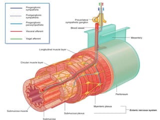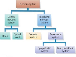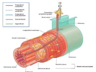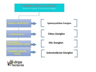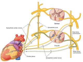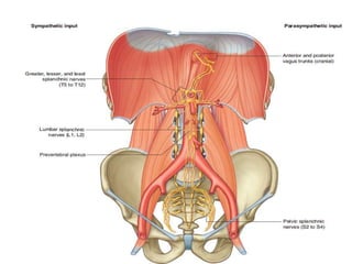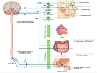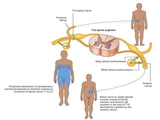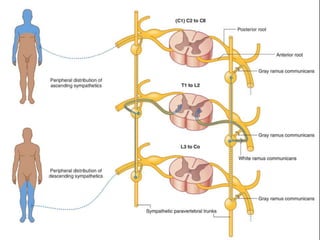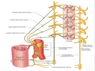 The document discusses the autonomic nervous system, specifically the sympathetic nervous system. It describes the locations of the sympathetic trunk and ganglia in the thoracolumbar region from T1 to L2. It also discusses the cervical ganglia, splanchnic nerves arising from the thoracic sympathetic trunk, and that the splanchnic nerves carry preganglionic sympathetic fibers except for the pelvic splanchnic nerves which carry parasympathetic fibers. The document is intended to teach about the anatomy and pathways of the autonomic nervous system.