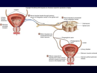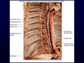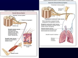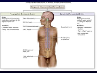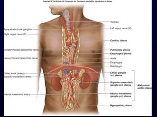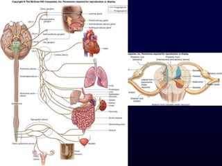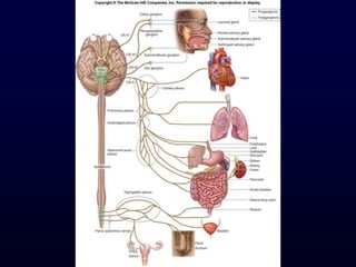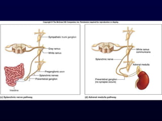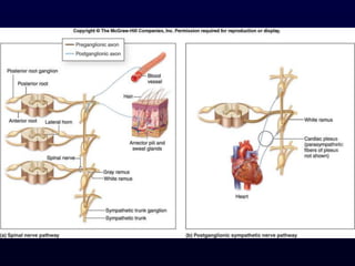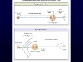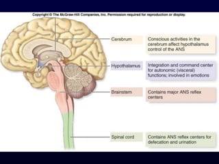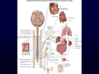This document provides an overview of the autonomic nervous system (ANS). It discusses the two divisions of the ANS - the sympathetic and parasympathetic divisions. The sympathetic division is involved in the fight or flight response and increases heart rate, breathing, etc. The parasympathetic division is involved in rest and digest functions like digestion. The document details the pathways, ganglia, nerves and effects of both divisions. It notes that the hypothalamus and brainstem have significant control over autonomic function.