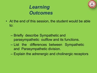 This document discusses the autonomic nervous system. It begins by describing the sympathetic and parasympathetic divisions, including their origins in the spinal cord/brainstem and functions. The sympathetic division prepares the body for fight or flight while the parasympathetic division allows for rest and restoration. The document then covers the pathways of the autonomic motor neurons, including the locations of preganglionic and postganglionic neurons. It also discusses the major autonomic ganglia and compares the somatic and autonomic motor neurons.
