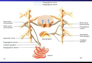 2. It describes the anatomy of the autonomic nervous system, including that the sympathetic division neurons are in the spinal cord and project to ganglia, while the parasympathetic division neurons are in the brainstem and sacral spinal cord.