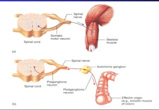 1. It contrasts the somatic and autonomic nervous systems, noting their anatomical differences like neuron location and target tissues, as well as functional differences in control and response.