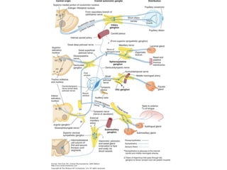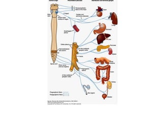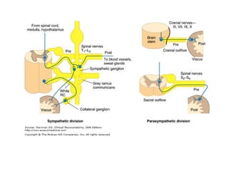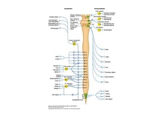 The autonomic nervous system consists of sympathetic and parasympathetic divisions that regulate organs through two-neuron chains. The sympathetic division originates in the spinal cord and targets organs like the heart and blood vessels. The parasympathetic division originates in the brainstem and sacral spinal cord and targets the digestive system. Sensory fibers carry visceral sensation to the CNS while the autonomic plexuses distribute efferent fibers to target organs.