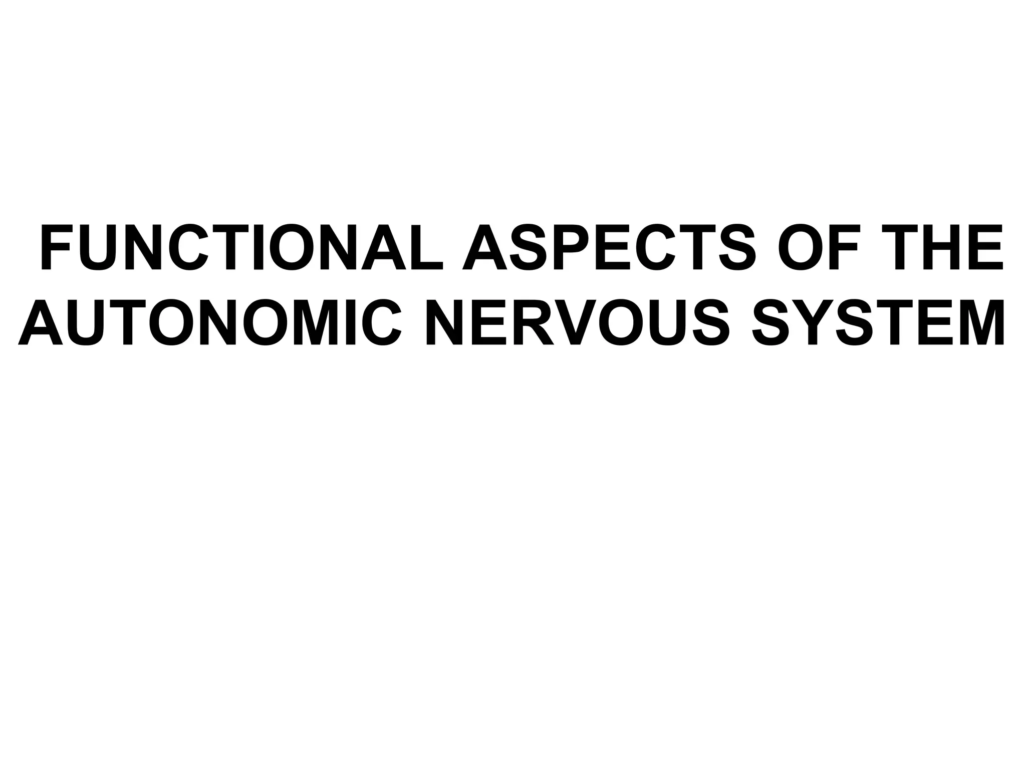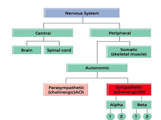 The autonomic nervous system regulates involuntary body functions and is divided into the sympathetic and parasympathetic systems. The sympathetic system is associated with the "fight or flight" response and increases heart rate and metabolism. The parasympathetic system is involved in "rest and digest" functions and decreases heart rate and increases digestion. Both systems contain two neurons - a preganglionic neuron originating in the CNS and a postganglionic neuron connecting to the target organ. The sympathetic system uses norepinephrine and the parasympathetic system uses acetylcholine as neurotransmitters. The autonomic nervous system is regulated by regions of the brainstem and limbic system.