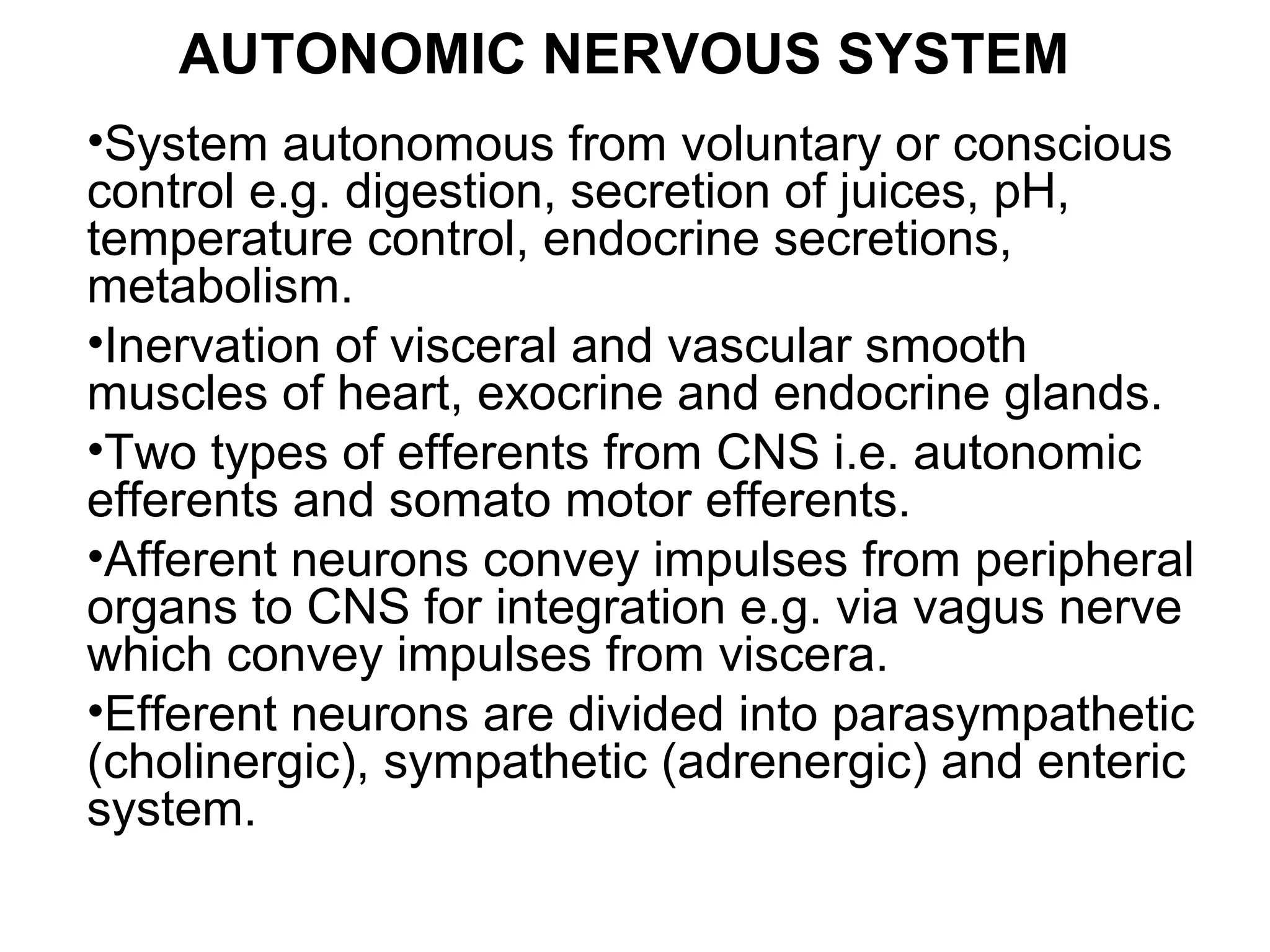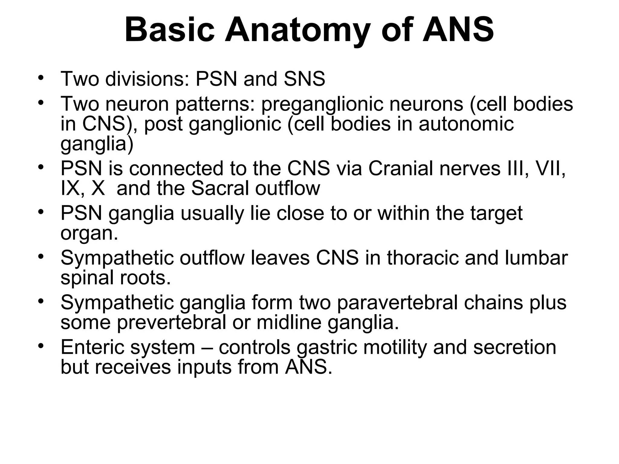 The document discusses the autonomic nervous system (ANS) and acetylcholine (Ach) neurotransmission. The ANS controls involuntary functions and is divided into the parasympathetic (PSN) and sympathetic (SNS) systems. Ach is the main neurotransmitter of the PSN and SNS. It binds to muscarinic and nicotinic receptors. Cholinergic drugs like anticholinesterases inhibit Ach breakdown, increasing its effects. They are used to treat conditions like myasthenia gravis but have side effects like excessive secretions. The document covers the synthesis, storage, release and effects of Ach in detail.