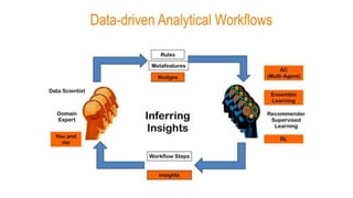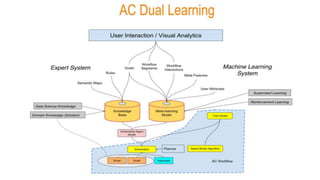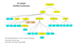 This document describes an autonomous analytics platform that allows users to analyze streaming data. The platform uses a unified big data technology stack including Spark, Cassandra, Hadoop, Kafka and Elasticsearch. It has a cloud-agnostic architecture and supports multiple machine learning frameworks. The platform includes a Domain Specific Language (DSL) that allows power users to create full data pipelines and analytics workflows with a few lines of code. It also includes a DSL Workbench for interactively building, editing and publishing analytical pipelines. Additionally, the document introduces "Auto Curious", which harnesses user interactions to autonomously discover insights and compose DSL commands through a question graph interface.