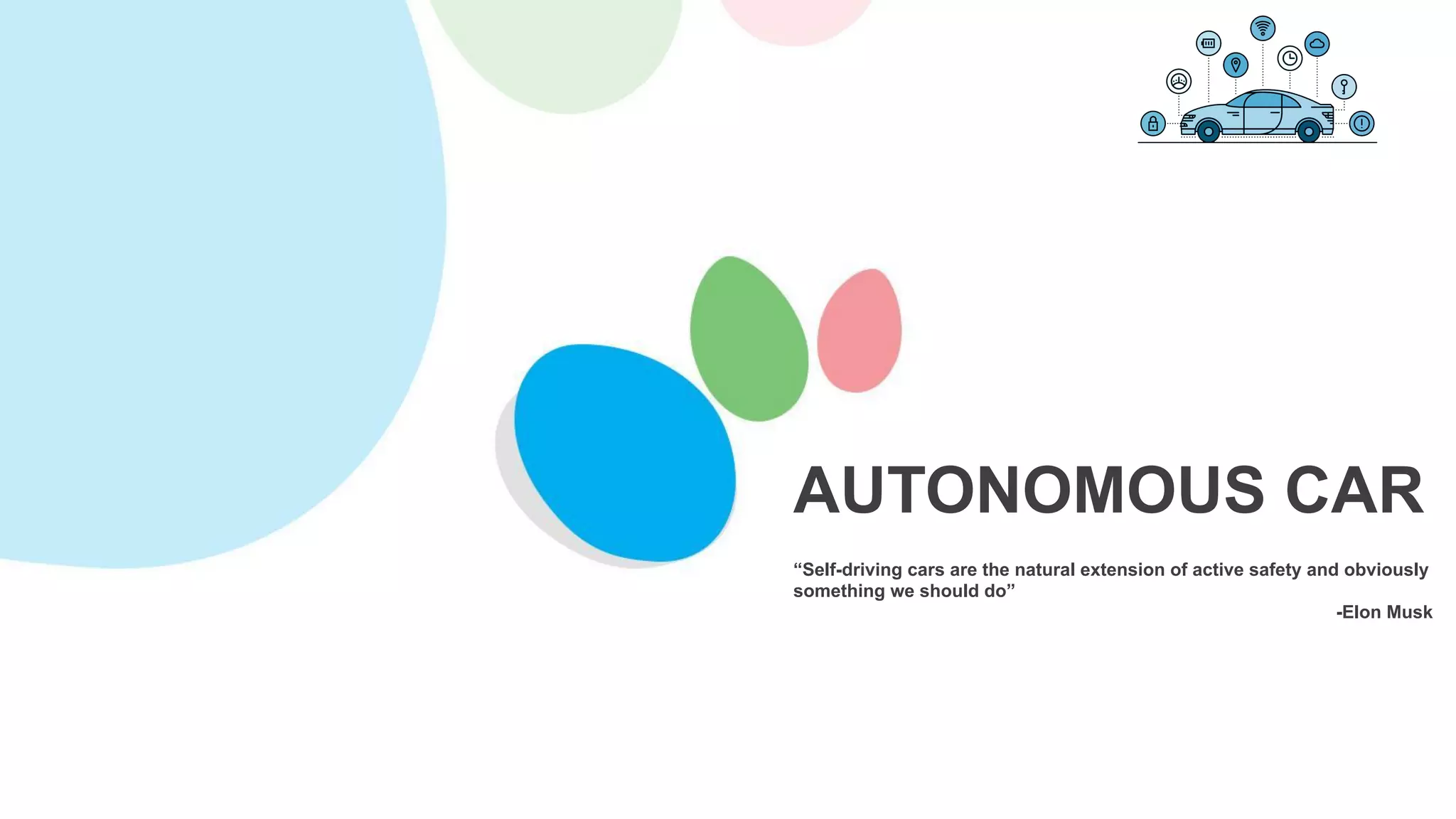 The document discusses the rise of autonomous vehicles (AVs), predicting that 10 million will be on the roads by 2022 and that they will generate a $7 trillion annual revenue stream by 2050 while potentially reducing vehicle crashes by 90%. It details the technology behind AVs, including sensors like lidar and radar, and the complex algorithms that enable them to navigate safely. The document also highlights legal and societal implications, including liability issues and potential job losses, raising questions about the future of driving and regulation.