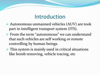 Autonomous unmanned vehicles are part of intelligent transport systems and are either self-driving or remotely controlled. They are used in critical situations like bomb disposal or vehicle tracking. Autonomous vehicles can operate on the ground, in the air, in water, or in space. They have benefits like being eco-friendly, reducing transportation time and labor needs, having high fuel efficiency and speed.
