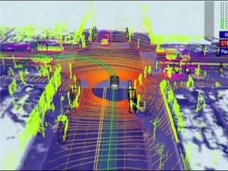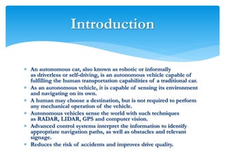 An autonomous vehicle uses sensors like radar, LIDAR, GPS and computer vision to navigate without human input. Radar uses radio waves to determine distance, speed and track objects. LIDAR uses lasers to precisely map physical features. GPS provides maps, directions and real-time traffic data. Computer vision allows the vehicle to analyze images of the road and environment. Together these technologies allow autonomous vehicles to drive itself, potentially reducing accidents.