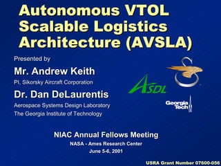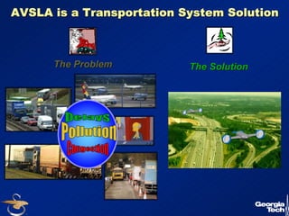 The document discusses Phase I and Phase II of the Autonomous VTOL Scalable Logistics Architecture (AVSLA) project. Phase I demonstrated the feasibility of using autonomous aircraft for cargo delivery and identified areas for further research. Phase II aims to develop a system-of-systems model to further analyze delivery network topology, scheduling, and control distribution options. It will also explore expanding the system to a national scale and urban settings. Key research areas include vehicle autonomy, air traffic management integration, and understanding package delivery economics and operations.