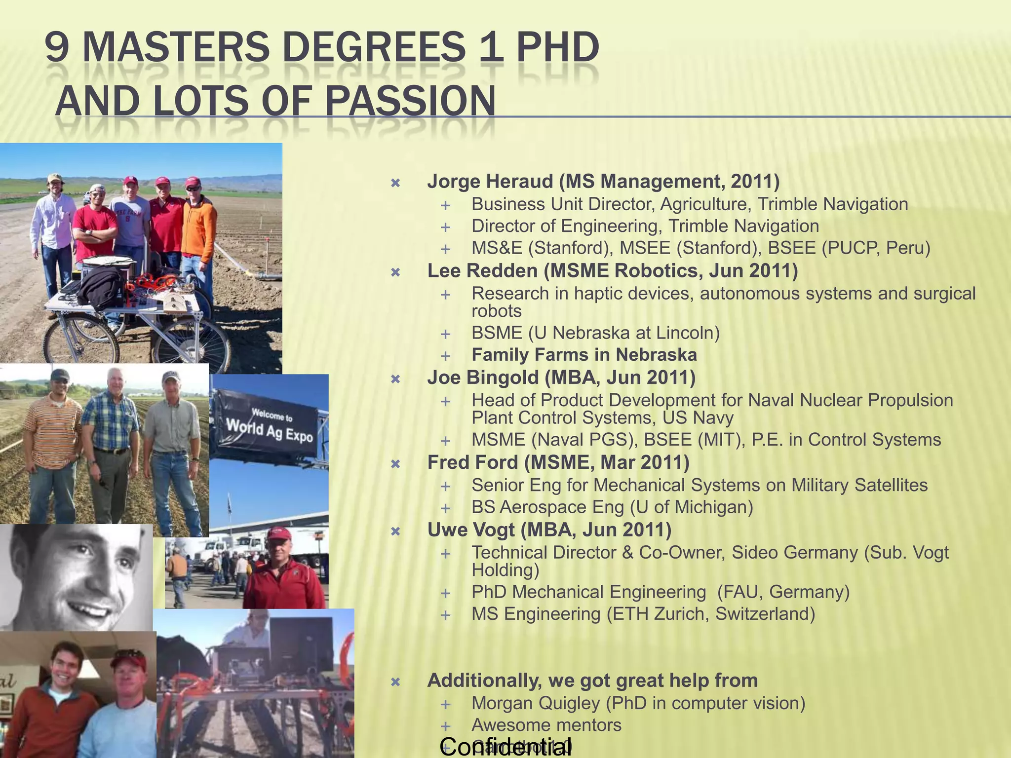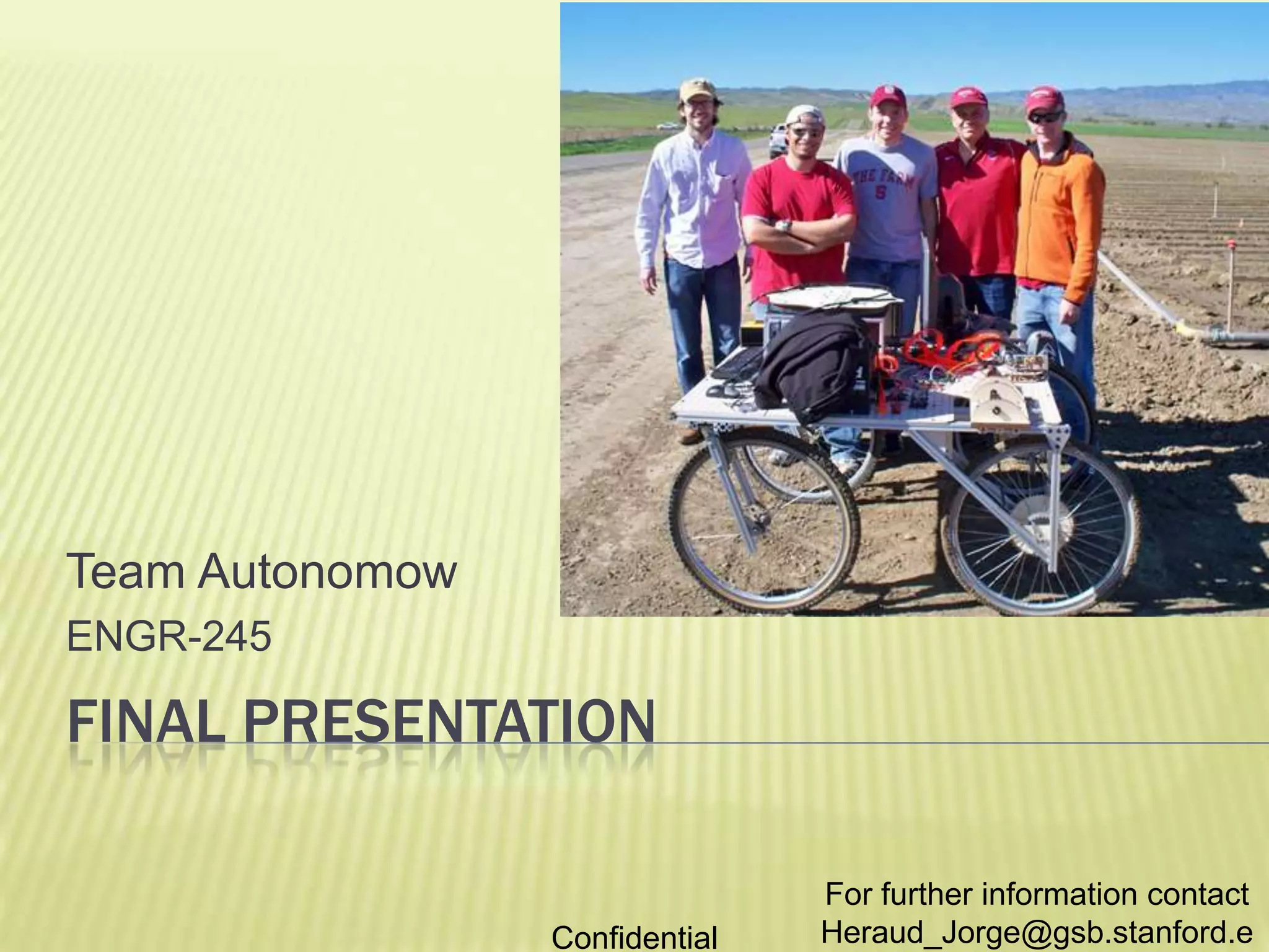 The document summarizes a team's final presentation on their autonomous vehicle project called Autonomow. It introduces the 9 team members and their backgrounds. It then describes the team's initial business plan to develop and sell autonomous vehicles for mowing and weeding applications to reduce labor costs. The team conducted extensive customer interviews and research, culminating in the development of a prototype weed-eliminating robot called "Carrotbot" over the course of a week. The presentation outlines the technical challenges and opportunities in weed identification and elimination, and validates a market need among farmers struggling with manual weeding labor. It proposes a business growth path focusing initially on providing an autonomous weeding service to organic vegetable growers.