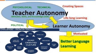 Teacher autonomy refers to a teacher's independence and professional discretion in making decisions related to their teaching practice. It includes the freedom to determine course content and teaching methods, as well as the capacity for self-directed professional development and growth. While teacher autonomy provides benefits like improved responsiveness to student needs, it also faces challenges such as inconsistent education policies across states and a lack of training for teachers. The National Education Policy of 2019 supports enhancing teacher autonomy through career progression plans and allowing innovation in curriculum and pedagogy.