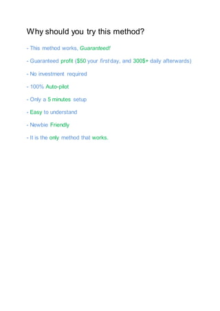 This document provides instructions for an "autopilot" money making method that requires little effort or investment. It claims the method is guaranteed to earn $50 the first day and $300+ daily afterwards. The 10 steps involve: 1) Signing up for a referral program website; 2) Downloading and customizing an eBook with your referral link; 3) Uploading the eBook to free file sharing sites like Scribd and SlideShare to generate downloads and referrals; 4) Earning $250-1000 daily from referral commissions as the eBook gains 3000-5000 daily downloads. Users are asked to post payment proofs to help promote the method.