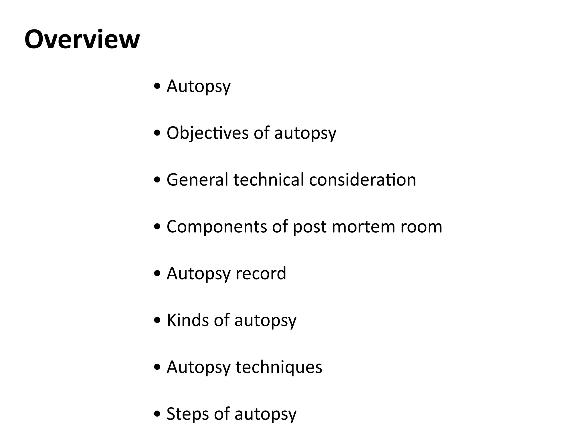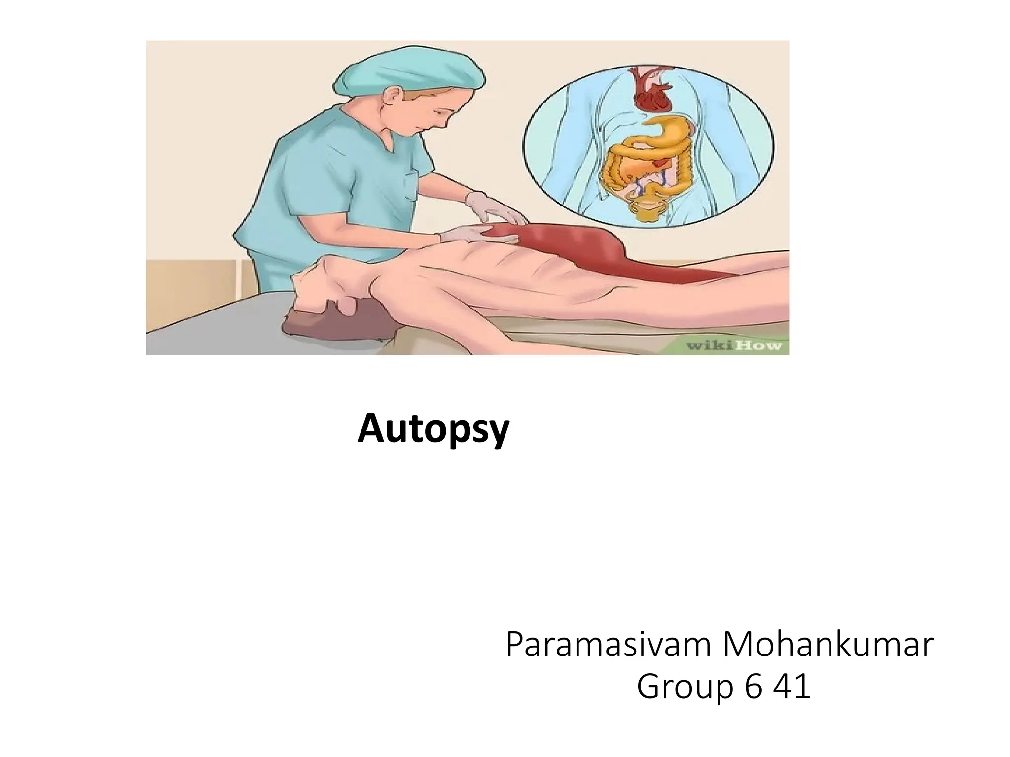 An autopsy is a systematic examination of a deceased individual for medical, legal, or scientific purposes, requiring a thorough investigation of all body organs. The objectives include identifying the cause of death, recognizing diseases, and gathering data for education and statistical purposes. The document outlines various autopsy types, techniques, and the essential components of an autopsy room.