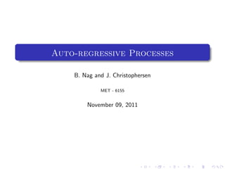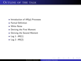 The document outlines auto-regressive (AR) processes of order p. It begins by introducing AR(p) processes formally and discussing white noise. It then derives the first and second moments of an AR(p) process. Specific details are provided about AR(1) and AR(2) processes, including equations for their variance as a function of the noise variance and AR coefficients. Examples of simulated AR(1) processes are shown for different coefficient values.