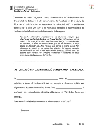 AUTORITZACIÓ PER L’ADMINISTRACIÓ DE MEDICAMENTS A L’ESCOLA