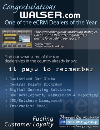 The document discusses various training and marketing strategies for automotive dealerships, highlighting successful case studies like Tasca Automotive and Walser Automotive. It emphasizes the importance of digital marketing, customer satisfaction, and the implementation of effective CRM tools to boost sales and customer loyalty. Additionally, it outlines the efforts of Sheehy Automotive to transform its internet department into a profitable center through comprehensive digital strategies.